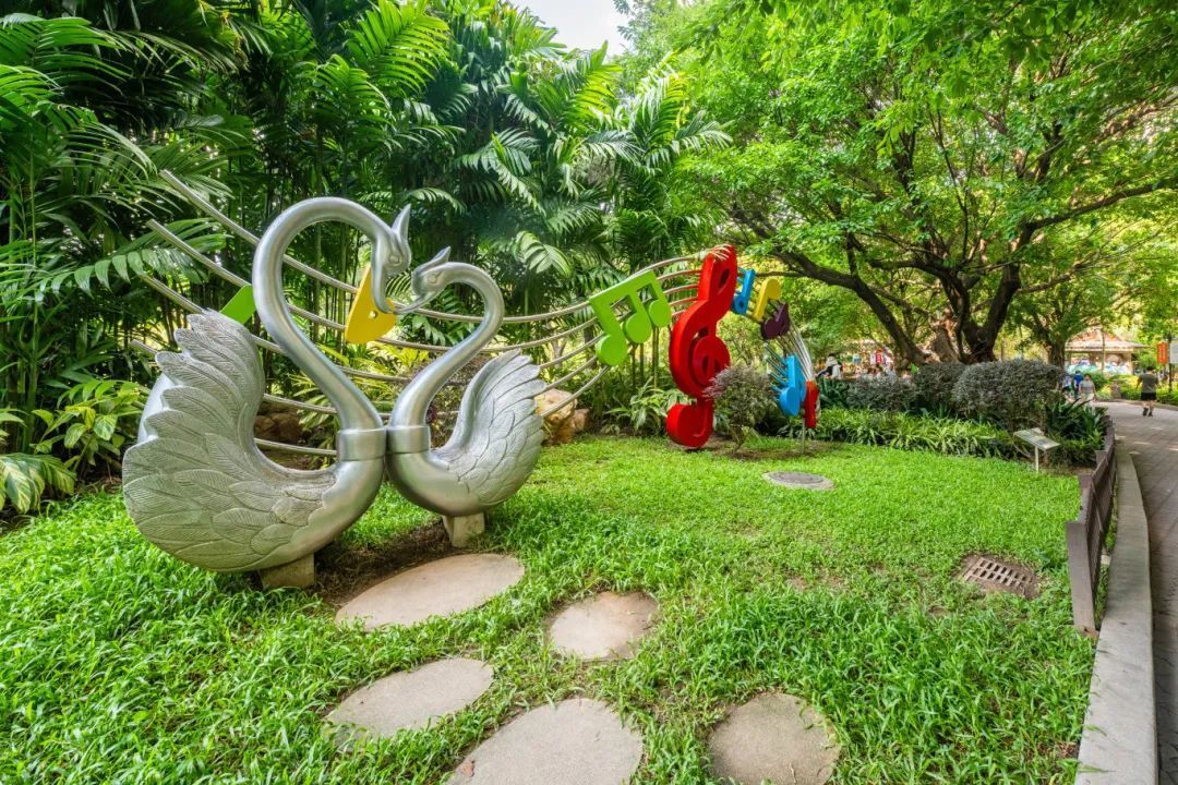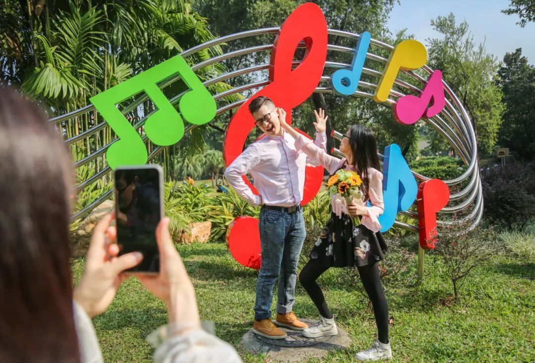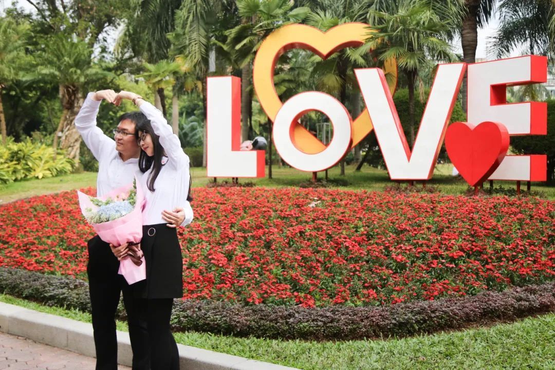 因越秀区民政局婚姻登记处坐落于此,东风公园成为无数“新人”爱情旅程的起点,也因此被赋予了独特的浪漫属性。近年来,东风公园融入“花城有囍”主题元素,精心设计“丘比特”“对鹅”等爱情主题雕塑、“幸福之门”拱门等艺术装置,每一处造景都寄托着对“新人”的美好祝福。