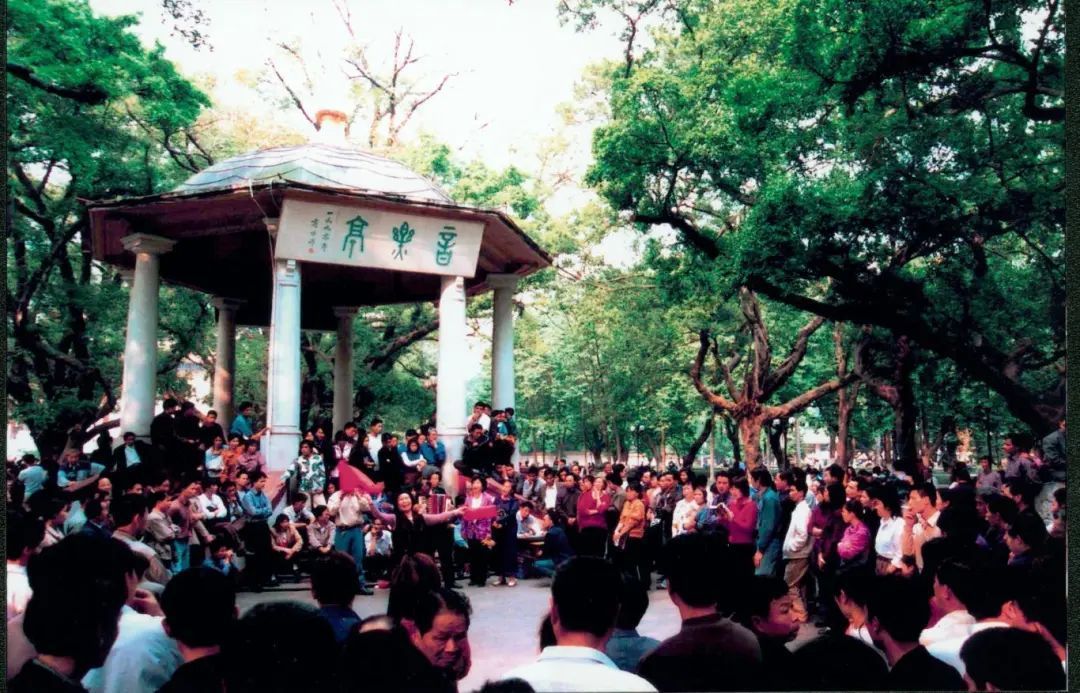 图示:节庆日,音乐亭前举行大型群众性文化活动(2000年,图/越秀区国家档案馆);闲时,这里也是市民休闲健身之地(2025年,图/胡瀛斌)。