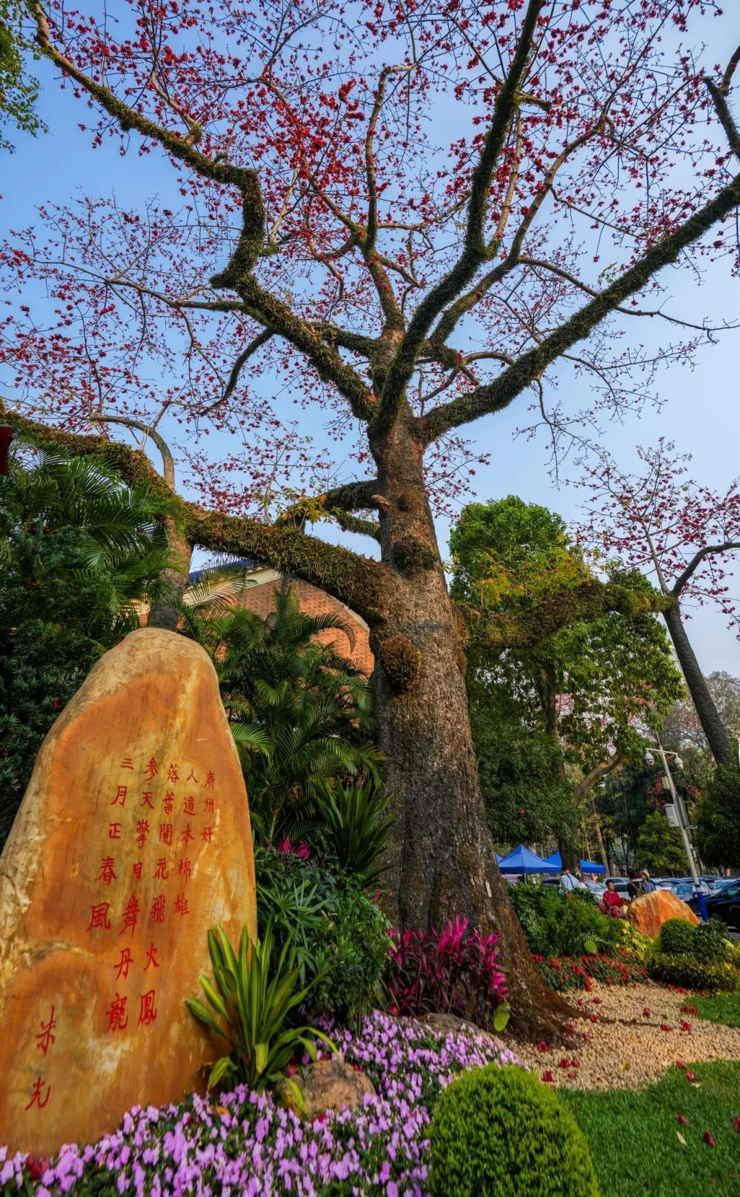 图示:三月,中山纪念堂“木棉王”盛放,宛若红霞。(图/越秀区融媒体中心)