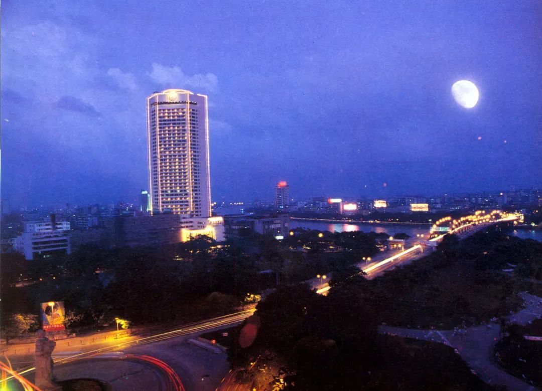 图示:华厦大酒店夜景(1991年,上)、中国出口商品陈列馆(20世纪60年代,中)、绿草如茵的海珠广场(1984年,下)(图/越秀区国家档案馆)